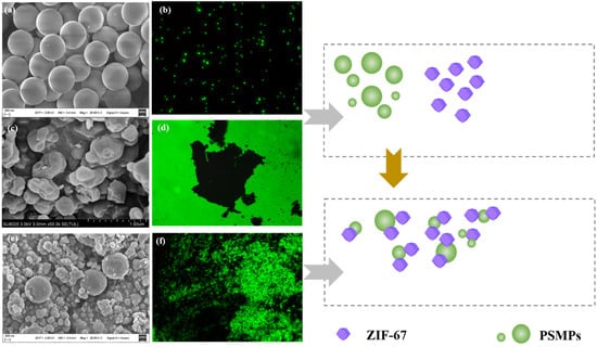 SEM and fluorescence image of PSMPs (a,b), ZIF-67 (c,d), and the ZIF-67/PSMP composite after adsorption (e,f), and schematic representation of PSMP adsorption by ZIF-67.