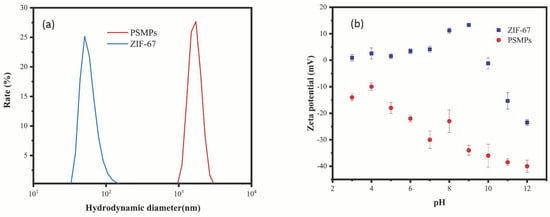 Hydrodynamic diameter distribution (a) and Zeta potential (b) of PSMPs and ZIF-67 in aqueous solution.