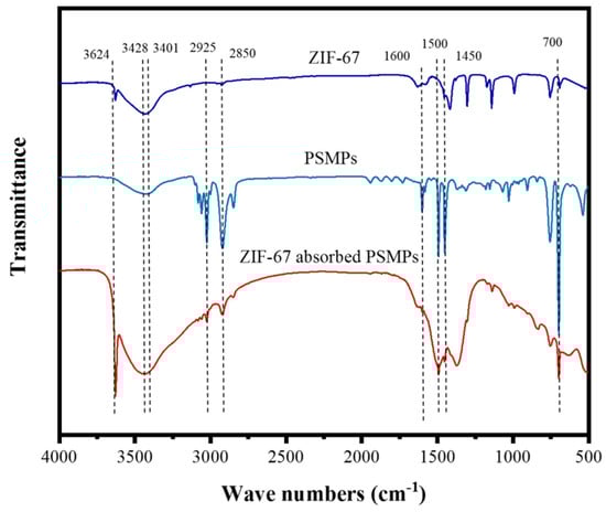 The FTIR spectra for PSMPs and ZIF-67 during the adsorption process are illustrated in Figure 3. For PSMPs, the absorption peak at 700 cm−1 was attributed to the single substitution peak of the benzene ring [52]. The peaks for PSMPs at 1450, 1500, and 1600 cm−1 were attributed to the skeleton vibration of the benzene ring [53,54]. Moreover, the peaks at 2850, 2925, and 3031 cm−1 in the PSMPs were mainly attributed to the C-H stretching of aliphatic compounds, whereas the peak at 3420 cm−1 was assigned to -OH in the PSMPs [55,56]. The FTIR peak for ZIF-67 was mainly ascribed to the ligand 2-methyl in the MOF material [57]. The peak observed at 600–1500 cm−1 was attributed to the stretching vibration of the imidazole ring in ZIF-67, whereas the peak at 3428 cm−1 was linked to the stretching vibration of N-H and -OH [43]. After the adsorption process, the characteristic peaks for PSMPs (700, 1450, 1500, 1600, 2850, 2925, 3031, and 3420 cm−1) were observed in the ZIF-67/PSMP composite, thus confirming that the PSMPs were adsorbed on the surface of ZIF-67. Additionally, the peak at 3300–3700 cm−1 in the ZIF-67 (after PSMP adsorption) was mainly related to the vibration of hydroxyl groups [51]. In turn, this hydroxyl vibration was mainly ascribed to the interaction between Co-OH or -NH (in ZIF-67) and the -OH (in PSMPs) [43,47,58]. Furthermore, the imidazole ring (in ZIF-67) could be regarded as an aromatic compound, which could interact with other aromatic compounds (in PSMPs) through π-π stacking interaction [43]. Therefore, the π-π stacking interactions should also be presented between the ZIF-67 and in PSMPs in an aqueous solution [59,60]. Therefore, hydrogen bonding and π-π stacking strengthened the interaction between ZIF-67 and PSMPs in the aqueous solution.