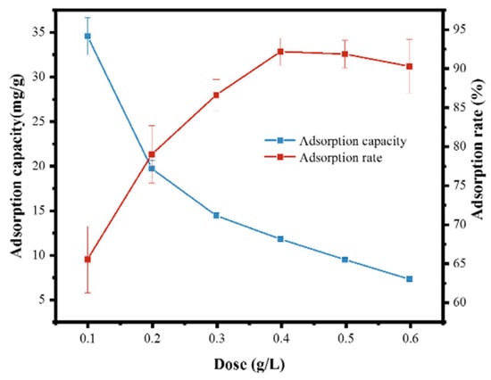 Figure 4 illustrates the effect of the ZIF-67 dose on PSMP removal in aqueous solution. At a ZIF-67 dose ranging from 0.1 to 0.6 g/L, the adsorption ratio of PSMPs by ZIF-67 increased from 65.4% to 90.2%. It could be attributed to the fact that more ZIF-67 could provide more adsorption sites for PSMPs. However, once the ZIF-67 dose exceeded 0.4 g/L, the adsorption ratio remained largely constant. Furthermore, the adsorption capacity of PSMPs by ZIF-67 decreased from 34.5 to 7.2 mg/g when the ZIF-67 dose increased from 0.1 to 0.6 g/L (Equation (2)). The highest adsorption rate (92.1%) and adsorption capacity (11.6 mg/g) of PSMPs in an aqueous solution was observed at a ZIF-67 dosage of 0.4 g/L. Thus, the optimal dosage of ZIF-67 for the removal of PSMPs should be selected as 0.4 g/L.