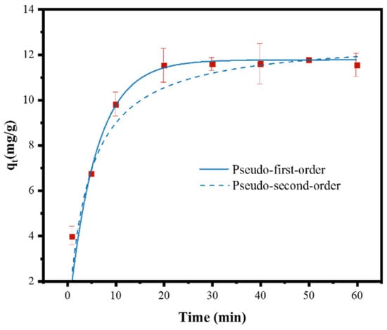 The experimental results for the adsorption of PSMP by ZIF-67 were fitted by the pseudo-first-order and pseudo-second-order models, as shown in Figure 5 and Table 1. The calculated R2 for the pseudo-second-order kinetic model (0.981) was close to that of the pseudo-first-order model (0.977). However, the theoretical equilibrium adsorption capacity (11.7 mg/g) calculated by the pseudo-first-order kinetic equation was closer to the actual adsorption capacity (11.6 mg/g). Therefore, the pseudo-first-order kinetic equation was deemed more suitable for describing the adsorption of PSMPs by ZIF-67. These findings indicate that the removal of PSMPs by ZIF-67 is largely mediated by physical adsorption [61]. The adsorption rate constant of ZIF-67 for PSMPs was 0.171 min−1, which meant that ZIF-67 could reach the adsorption equilibrium for PSMPs within a short time [62].