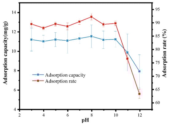 Effect of pH on PSMP adsorption capacity and rate by ZIF-67 (conditions: PSMP concentration, 5 mg L−1; ZIF-67 dose, 0.4 g/L; temperature, 298 K; reaction time, 20 min).