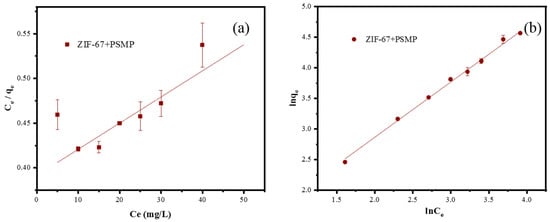 Fitting adsorption isotherm models of PSMPs by ZIF-67 (conditions: PSMPs concentration, 5 mg L−1; ZIF-67 dose, 0.4 g/L; temperature, 298 K; reaction time, 20 min). (a) Langmuir model; (b) Freundlich model.