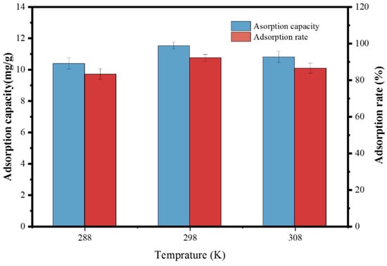 Figure 9 illustrates the effect of contact temperature on the adsorption of PSMPs by ZIF-67. When the contact temperature ranged from 288 to 308 K, the PSMP adsorption rate by ZIF-67 in the aqueous solution first increased slightly (from 83.1% to 92.1%) and then decreased (from 92.1% to 86.4%). This increase in adsorption capacity (from 10.3 mg/g to 11.5 mg/g) with increasing contact temperature (from 288 K to 298 K) was linked to the fact that the adsorption of PSMPs by ZIF-67 was mainly driven by physical adsorption (particularly at 288 K). Here, the adsorption of PSMPs by ZIF-67 was mainly attributed to chemical adsorption, whereas the number of adsorption active sites at 298 K increased with increasing contact temperature. However, the slight decrease in adsorption capacity observed in our experiments (from 11.5 to 10.6 mg/g) was likely due to the desorption of PSMPs from the ZIF-67 due to the increase in the thermal motion of particles with increasing temperature [66,67]. Therefore, our findings confirmed that increasing the temperature negatively affects the removal of MPs by MOF materials in aqueous solution. Furthermore, the relatively higher adsorption rate (92.1%) of PSMPs by ZIF-67 was determined at a contact temperature of 298 K. The correlation observed between adsorption rate and temperature was not obvious; thus, the Freundlich model constants at varying temperatures could not be calculated. Therefore, the thermodynamic results would not be further discussed.