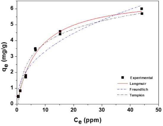 | Langmuir | qm = 6.846 mg/g b = 0.132 L/mg | 0.991 | 0.037 |