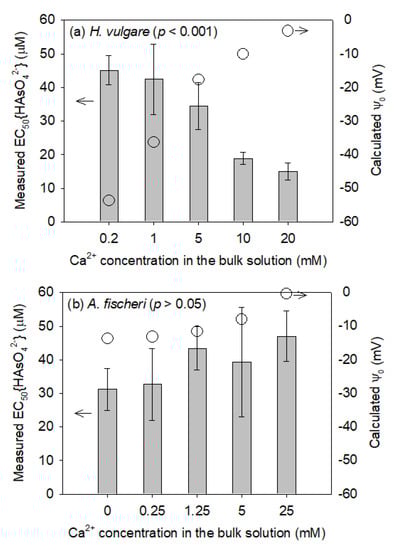 Measured EC50 values expressed as HAsO42− activity (left y-axis) obtained from (a) root elongation tests using Hordeum vulgare and (b) bioluminescence inhibition tests using Aliivibrio fischeri (data obtained from An et al. []). Calculated cell membrane surface electrical potential (Ψ0) (right y-axis) for (a) H. vulgare and (b) A. fischeri with varying Ca2+ concentrations. Solid bars and error bars indicate the EC50 values and their standard deviations (n = 3), respectively. Open circles represent the calculated Ψ0 values. The p-value of the ANOVA test was >0.05, indicating that Ca2+ addition did not significantly affect As(V) toxicity.