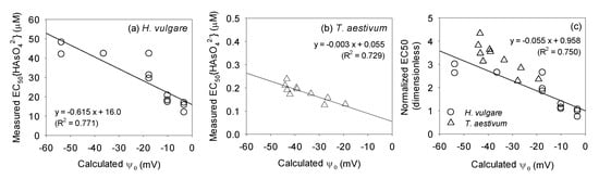 A negative linear relationship (slope = −0.615, R2 = 0.771) between the calculated Ψ0 and measured EC50{HAsO42−} of H. vulgare is shown in Figure 2a. Wang et al. [] revealed a similar trend in wheat T. aestivum (slope = −0.003, R2 = 0.729; Figure 2b). The slopes of the linear relationships between the calculated Ψ0 and measured EC50{HAsO42−} were different owing to the differences in species sensitivity to As(V). Therefore, the normalized EC50, which can be defined as the measured EC50{HAsO42−} divided by the y-axis intercept of the negative linear relationship (i.e., a situation where Ψ0 = 0), was used to quantify the effect of Ψ0 when compensating for species sensitivity (Figure 2c). Herein, the same negative linear relationship (slope = −0.055, R2 = 0.742) was obtained for both species (H. vulgare and T. aestivum). This indicates that the influence of Ψ0 is not a plant-specific property but a physicochemical property based on the attraction or repulsion of As(V) with the PM surface. Consequently, the effect of Ψ0 could be considered in a similar way for various plants that have a negatively charged PM surface.