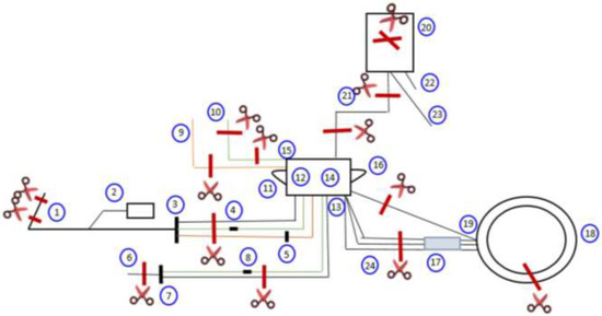 DEHP contents in the apheresis kit, and details of the sections for its determination. 1: Inlet line; 2: diversion bag; 3: inlet line manifold; 4: inlet saline line clamp (red); 5: anticoagulant (AC) check valve; 6: return line; 7: return line manifold; 8: return saline line clamp (blue); 9: AC line (orange); 10: saline line (green); 11: inlet line trap; 12: inlet pressure sensor diaphragm; 13: centrifuge pressure sensor diaphragm; 14: reservoir; 15: return pressure sensor diaphragm; 16: collect pressure sensor diaphragm; 17: centrifuge loop; 18: channel; 19: connector; 20: collection Bag; 21: collect line; 22: sample bulb assembly; 23: accessory line; 24: manifold to channel.
