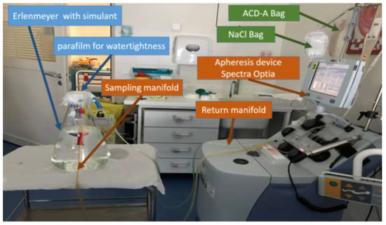 - Contact time: The collection time was dependent on the patient. In the literature, the average collection time was 2–5 h [20]; therefore, the experiment was performed for a duration of 185 min, which is the average duration of a pre-CAR-T cell collection procedure performed in our hospital (n = 7).