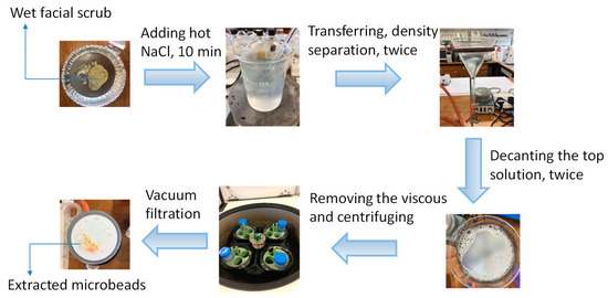 Schematic diagram of the whole process to extract microbeads from facial scrub for use in the exposure studies. More details are given in Section 2.1.