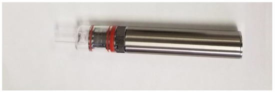 Four vape pens were used in the previous study: Kind Discreet (ceramic type horizontally positioned coil), Kind Mist (ceramic type vertically positioned coil), Kind Dream (dab-type ceramic with two horizontally positioned coils), and Joyetech eVic (horizontal coil wrapped around a cotton wick) [9]. The Kind Dream (dab-type) device (Figure 1), which belongs to one of the fastest-growing groups in the cannabis market [16], was chosen for our study because it allowed us to test the entire range of THC/VEA mixtures: VEA, 20%/80% THC/VEA, 50%/50% THC/VEA, 80%/20% THC/VEA, and THC. VEA, as well as THC/VEA mixtures, are liquid oils that can be loaded into basically any type of vape pen. THC is a highly viscous wax, so it was extremely difficult to load it into the vape pen tank designed for liquids and then clean the tank after the test.