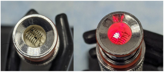 The Kind Dream vape pen allows for three heating temperature set points of low, medium, and high (350 °F, 390 °F, and 430 °F, respectively). Two temperature settings were used during the tests: low 350 °F (~177 °C) and high 430 °F (~221 °C). An infra-red IR-thermometer (Micro Epsilon, Model-CTLM-3H1-CF3-C3, Ortenburg, Germany) that allows temperature monitoring in real-time (every 0.1 s) was used for independent temperature measurements. To conduct temperature measurements, the glass mouthpiece of the vape pen was removed (Figure 2), chemicals (VEA, or 50%/50% THC/VEA, or THC) were loaded into the vape pen, and the infra-red beam was directed onto the heating coil. The temperature of the heating coil was monitored for each chemical mixture at both temperature set points while heating power was turned on for 5 s then off for 60 s. This cycle was repeated eight times to simulate puffing topography conditions used for aerosol generation. Each set of measurements consisted of 8 “puffs” and was repeated at least three times.