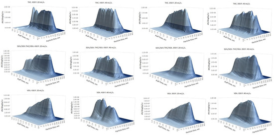 Results of the DMS500 measurements are presented in Table 1 and Table 2 and Figure 4, Figure 5 and Figure 6. All particle size distribution spectrums taken for different chemicals mixtures and at both temperature settings showed log-normal distributions (Figure 4). Count median diameter varied from 73 nm to 186 nm with geometrical standard deviations between 1.6 and 1.8. (Table 1). Particle number concentration (Table 2) was within ~2 × 107 to ~1 × 108 particles per cc (cubic cm). The most drastic influence on particle size was observed when chemical composition, as well as flow rate, were changed. VEA aerosol showed the smallest particle size, and an increase of the flow rate further decreased the CMD (to below 100 nm), which was consistent with our previous observations [9]. Changes in heating power had a very slight effect on particle size.