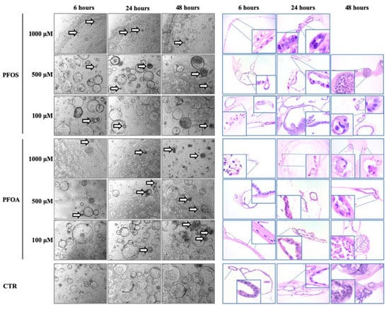 According to previously reported cytomorphological evidences, microscopic examination of H&E-staining revealed that liver organoids show the typical features of hepatic progenitors and mature hepatocytes []. Organoids were washed with PBS and embedded using Bio-Agar (Bio-Optica, Milano, Italy). Subsequently, the blocks were fixed in 10% neutral buffered formalin overnight and processed for paraffin embedding. Sections of 2.5 µm thickness were used for hematoxylin and eosin (H&E) staining by using Leica ST5020 Multistainer. Mouse liver organoids were evaluated and analyzed untreated and treated with 100, 500, 1000 µM selected PFAS and the induction of morphological changes evaluated at 6, 24 and 48 h by histological analysis.
