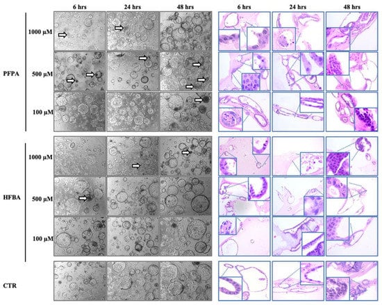 Similar to the EC50 experiments, the analysis with light microscopy revealed a similar growth for organoids treated with PFPA and HFBA with respect to untreated organoids although minor significant cytotoxic effects were observed (Figure 2). The effects of HFBA seem to be more pronounced if compared with PFPA, since a general reduction of cytostructural complexity has been observed in organoids treated with HFBA at 1000 μM at different time points (6, 24, 48 h). In detail, the initial nuclear hyperchromasia and reduced structural organization observed at 6 h of treatment were followed by loss of cells and architectural organization at 24 h and by reduction of cytostructural complexity after 48 h of HFBA exposure.