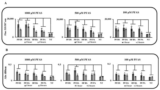 Exposure to pollutants may increase the activity of liver enzymes that are markers of hepatotoxicity. In order to define the health state of liver, the activity of these two key enzymes were evaluated at different time points and concentrations (Figure 3). ALT activity increased starting from the lowest concentration (100 µM) for both long- and short-chain PFASs (Figure 3A). GDH activity followed the same trend showing an increase from the lowest concentration of treatment (Figure 3B). The secretion of ALT and GDH was higher after one hour for all the doses and all the compounds, except for the production of GDH by PFPA that is the similar for 1 and 3 h.