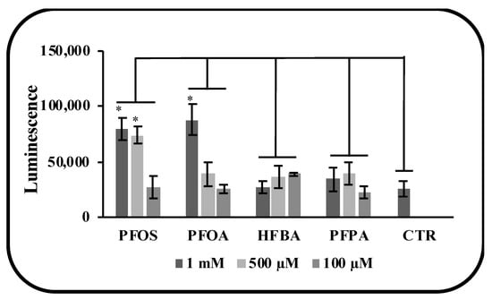 In order to assess the levels of hepatotoxicity, the activation of apoptosis was studied (Figure 4). Caspase 3 and 7, two key proteins of the apoptotic program, were analyzed at different concentrations of PFASs. Only long chain PFASs activated the apoptosis but at very high concentration (1000 µM). Short chain PFASs did not show a trend of activation in the range of 100–1000 µM.