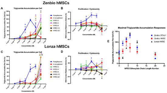 - Kassotis, C.D.; Kollitz, E.M.; Ferguson, P.L.; Stapleton, H.M. Nonionic ethoxylated surfactants induce adipogenesis in 3T3-L1 cells. Toxicol. Sci. 2018, 162, 124–136. [Google Scholar] [CrossRef] [PubMed]