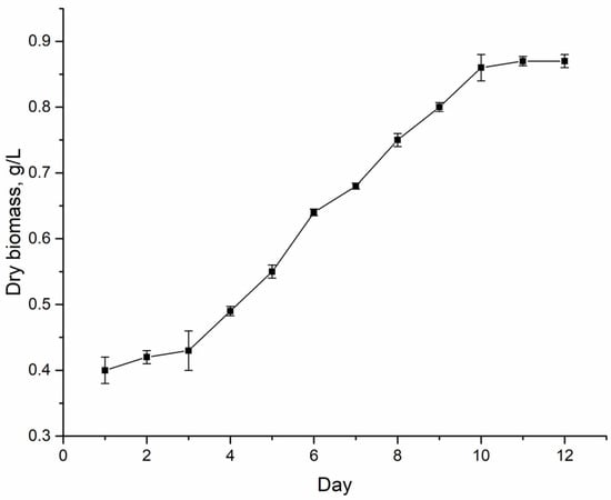 The content of chlorophyll and β-carotene in biomass was determined on the basis of ethanolic extracts. A mixture of 10 mg of biomass with 1.0 mL of 96% ethanol was prepared. Pigment extraction was performed by continuous stirring at room temperature for 12 h. The ethanolic extract was separated from biomass by centrifugation. The chlorophyll content was determined based on the absorbance at 665 nm and extinction coefficient of 0.8 × 105 M−1·cm−1, and β-carotene—based on the absorbance at 450 nm and extinction coefficient 1.5 × 105 M−1·cm−1 [].