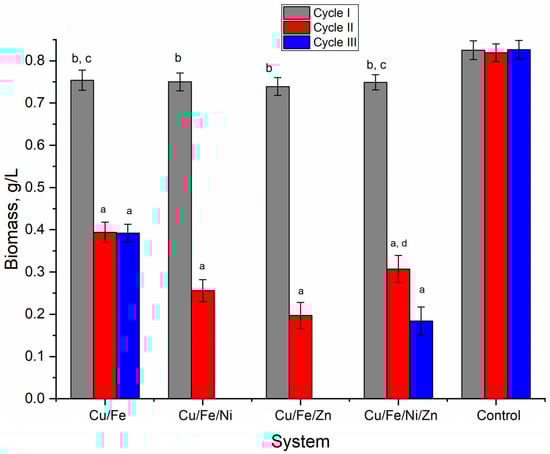 Nostoc linckia dry biomass accumulated at the end of three cultivation cycles in multimetal systems (a—p < 0.001 for the difference between experimental and control samples, b—p < 0.001 for the difference between the first and second cycle, c—p < 0.001 for the difference between the first and third cycles, and d—p < 0.001 for the difference between the second and third cycles).