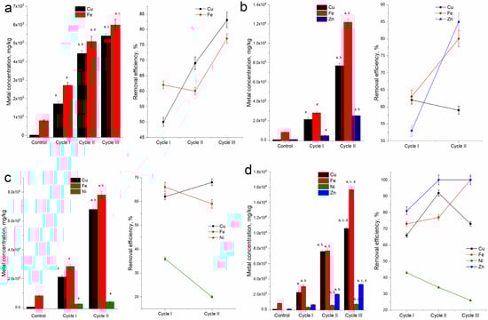 Bioaccumulation of copper and other metals by Nostoc linckia biomass during three life cycles in media containing multimetallic systems (a) Cu/Fe, (b) Cu/Fe/Zn, (c) Cu/Fe/Ni and (d) Cu/Fe/Ni/Zn (a—p < 0.001 for the difference between experimental and control samples, b—p < 0.001 for the difference between the first and second cycle, c—p < 0.001 for the difference between the first and third cycles, and d—p < 0.001 for the difference between the second and third cycles).