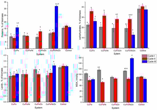 Total proteins; carbohydrates; lipids and malondialdehyde in Nostoc linckia biomass obtained over three cycles of cultivation in multimetallic systems (a—p < 0.001 for the difference between experimental and control samples, b—p < 0.001 for the difference between the first and second cycle, c—p < 0.001 for the difference between the first and third cycles, d—p < 0.001 for the difference between the second and third cycles).