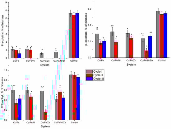 The most severely affected components of the nostoc biomass were phycobiliproteins, the content of which was reduced by 79.5–100.0% (Figure 4). In all analyzed systems after the first cycle of cultivation, the nostoc biomass contained small amounts of phycobiliproteins. In the second cultivation cycle, only the biomass in Cu/Fe and Cu/Fe/Ni systems contained about 2% phycobiliproteins, which constituted 18.6–19.2% of the value characteristic for the control sample. In the third cycle, only the biomass in the Cu/Fe system contained 1.16% of phycobiliproteins.