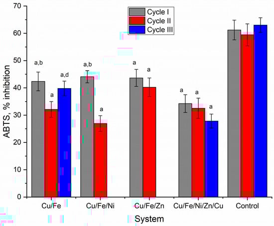 Antioxidant activity (% inhibition of ABTS+) of ethanolic extracts of Nostoc linckia biomass obtained during three cycles of cultivation in media containing multimetallic systems (a—p < 0.001 for the difference between experimental and control samples, b—p < 0.001 for the difference between the first and second cycle, d—p < 0.001 for the difference between the second and third cycles).