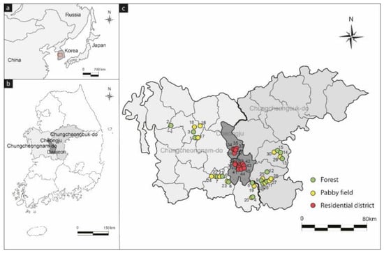 The study area was comprised of forests, agricultural lands, and residential districts. Forty-five samples were collected in 15 samples of the forest and paddy soil in Chungcheong province in southwest Korea (Yesan, Geumsan, Gongju, Okcheon, and Boeun) and 15 samples from residential districts in Sejong and Daejeon (Figure 1).