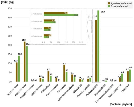 As shown in Figure 2, Proteobacteria was the dominant phylum in both agriculture and forest soil samples, followed by Actinobacteria and Acidobacteria. The phyla Firmicutes, Actinobacteria, and Chloroflexi showed relatively higher levels in agriculture soil than in forest soil, with differences of 3.9%, 2.5%, and 2.5%, respectively. In contrast, the phyla Proteobacteria, Acidobacteria, and Verrucomicrobia showed higher levels in forest soil than in agriculture soil, with differences of 5.2%, 3.7%, and 2.5%, respectively. The findings were similar to those reported by Lee et al. (2021) [13]. However, unlike previous studies showing that Acidobacteria was dominant, this phylum showed approximately 3.7% higher levels in forest soil than in agriculture soil in the present study. Acidobacteria may have been affected by factors other than the type of land use, such as regional differences.