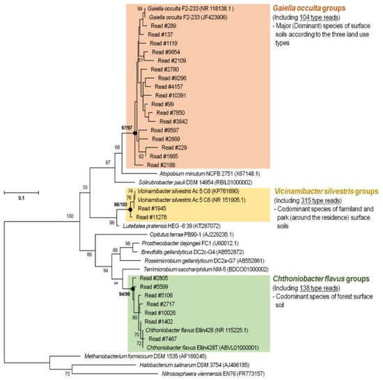 Maximum likelihood (using the Tamura-Nei distance model) tree showing the phylogenetic position of major and codominant species from topsoil of three land use types based on 16S rRNA gene sequences. Closed circle indicates corresponding branches recovered in the maximum likelihood/neighbor-joining (using the Kimura 2-parameter distance model) trees. Bootstrap values less than 50% based on 1000 replications are shown. Three archaea [Methanobacterium formicicum DSM 1535 (AF169245), Halobacterium salinarum DSM 3754 (AJ496185), and Nitrososphaera viennensis EN76 (FR773157)] were used as an out group. Bar, 0.1 nucleotide substitutions.