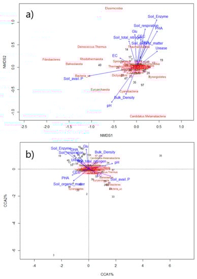 Results of (a) non-metric multidimensional scaling (NMDS) and (b) canonical correspondence analyses (CCA) for bacteria in the 30 soil samples with physicochemical data.