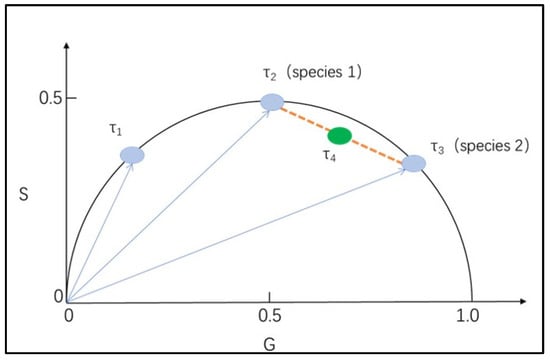 The fluorescence lifetimes of the images were analyzed by using Phasor-FLIM phasor analysis software. The concept of the universal circle in phasor images was defined by Jameson [55]. The universal circle is a semicircle with a radius of 0.5 that centered at (0.5, 0.0). As shown in Figure 1, each pixel in the fluorescence lifetime measurement map can be mapped to the corresponding phasor point in the phasor diagram, which is represented by coordinates (G, S). Each point on the semicircle represents a different lifetime, with the lifetime value decreasing from left to right. Longer lifetimes occur near the coordinates (0, 1), while shorter lifetimes occur near (0, 0) [48]. The phasor points resulting from the transformation of fluorescence lifetime information, whose positions depend on the number of photons each responsible fluorophore contributes to the phasor calculation. Therefore, phasors for single-exponential species are located in the universal circle. The phasor of a system composed of two different pure single-exponential species falls on the straight line that connects the phasor locations of the individual species in the semicircle [56,57,58]. Therefore, the phasor of a multicomponent sample is located inside the universal circle. Figure 2 shows a schematic diagram of the phasor transformation process. During phasor analysis, the fluorescence decay information from each pixel in the FLIM image is transformed into a point in the phasor plot. The phasor points corresponding to pixels with similar fluorescence decay characteristics are displayed in similar positions; this process forms a certain cluster distribution, known as a “phasor cluster”. This transformation allows for the analysis of different lifetime phasor clusters that can then be mapped back onto the image to create the FLIM images [59]. By circling the phasor clusters of interest with the cursor in the phasor diagram and finding the positions of the pixels corresponding to the phasor points on the sample through corresponding relationships, the regions with similar fluorescence characteristics in the sample can be marked, and vice versa. When different phasor cluster circles are selected with different pseudocolors, this method can also be used to realize a polychromatic display of fluorescence lifetime images [29].