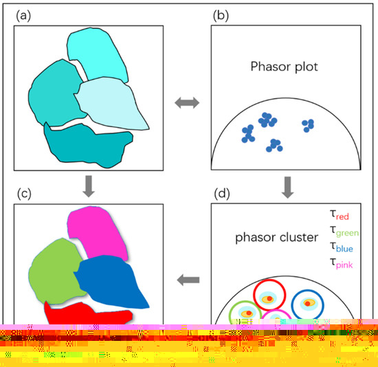 Figure 2. Schematic diagram of the Phasor-FLIM phasor analysis flow: (a) fluorescence intensity map containing unprocessed lifetime information; (b) lifetime phasor map obtained by FLIM-phasor analysis; (c) circle selection and acquisition of lifetime phasor clusters and the corresponding fluorescence lifetime values; (d) fluorescence lifetime maps of different phasor clusters obtained by phasor cluster analysis and pseudocolor labeling.