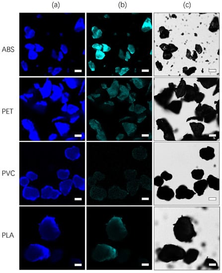 Figure 4. Fluorescence images resulting from excitation with different lasers and bright field images. (a) Autofluorescence images of ABS, PET, PVC, and PLA excited with a 405 nm laser; (b) autofluorescence images of ABS, PET, PVC, and PLA excited with a 440 nm laser; (c) white light images of ABS, PET, PVC, and PLA. The scale bar indicates 50 µm.