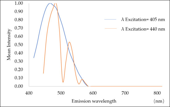 Figure 5. Autofluorescence emission spectra of ABS excited by 405 and 440 nm lasers.