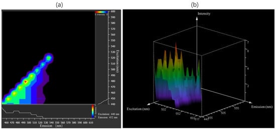 Figure 6. Excitation and emission spectral scans of microplastics. Taking ABS as an example, the horizontal axis is the emission spectrum detection range and the vertical axis is the excitation spectrum range. (a) ABS excitation/emission contour plot; (b) ABS excitation/emission 3D view.
