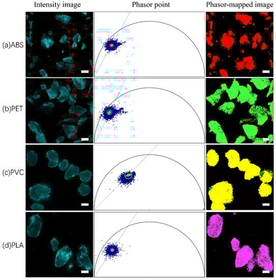 Figure 8. Application of phasor analysis to unstained microplastics: (a) fluorescence intensity image, phasor map, and fluorescence lifetime map for phasor cluster area mapping of unstained ABS, which corresponds to fluorescence lifetime τ ≈ 2.0 ns; (b) fluorescence intensity image, phasor map, and fluorescence lifetime map for phasor cluster area mapping of unstained PET, which corresponds to fluorescence lifetime τ ≈ 2.2 ns; (c) fluorescence intensity image, phasor map, and fluorescence lifetime map for phasor cluster area mapping of unstained PVC, which corresponds to a fluorescence lifetime τ ≈ 1.6 ns; (d) fluorescence intensity image, phasor map, and fluorescence lifetime map for phasor cluster area mapping of unstained PLA, which corresponds to a fluorescence lifetime τ ≈ 1.1 ns. The scale bar indicates 50 µm.
