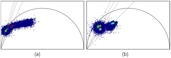 Figure 9. Phasor “fingerprint database”: (a) synchronous phasor analysis diagram for four microplastics stained with Nile red and (b) synchronous phasor analysis diagram for four unstained microplastics.