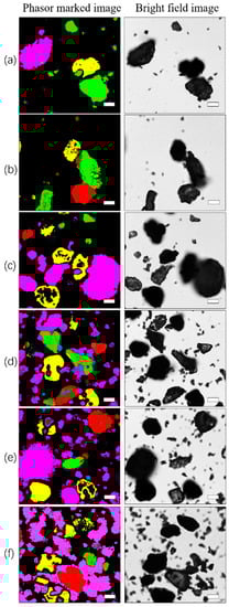 Figure 10. Identification and distinction of different microplastics: (af) phasor marked images on the left and bright field images on the right. The scale bar indicates 50 µm.