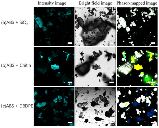 Figure 11. Identification of microplastics in a single interfering substance. (a) Fluorescence intensity image, bright field image, and fluorescence lifetime map of the phasor cluster area map of the mixture of ABS and SiO2; (b) fluorescence intensity image, bright field image, and fluorescence lifetime map of the phasor cluster area map of the mixture of ABS and chitin; (c) fluorescence intensity image, bright field image, and fluorescence lifetime map of the phasor cluster area map of the mixture of ABS and DBDPE. ABS was marked with white. The scale bar indicates 50 µm.