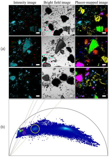 Figure 12. Identification of microplastics in sediments. (a) Fluorescence intensity image, brightfield image, and fluorescence lifetime map of phasor cluster area mapping of the mixture of four microplastics and sediments; (b) synchronous phasor analysis diagram for four microplastics and sediments. ABS, PET, PVC, and PLA microplastics were marked with red, green, yellow, and pink, respectively. The scale bar indicates 50 µm.