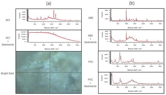Figure 13. Raman spectra: (a) from top to bottom: PET, PET and sediment mixtures, and sediment-covered PET; (b) from top to bottom: ABS, ABS and sediment mixtures, PVC, PVC and sediment mixtures.
