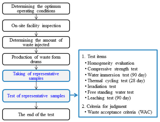 These factors are provided in notifications on nuclear power, quality assurance manuals for nuclear facilities, acceptance criteria for low- and intermediate-level radioactive waste, etc. The acceptance criteria for low- and intermediate-level radioactive waste specify the following requirements: (1) If the utility of the process is regularly evaluated every four years; (2) If the properties of waste can be changed by modifying the waste treatment process and procedures; (3) If compressive strength tests are conducted after every ten batches; (4) If all test samples were collected from actual waste drums or fabricated during the actual treatment process [8]. Figure 1 is a flowchart showing the procedures for assessing the utility of the cement solidification process, along with the test items for waste forms.