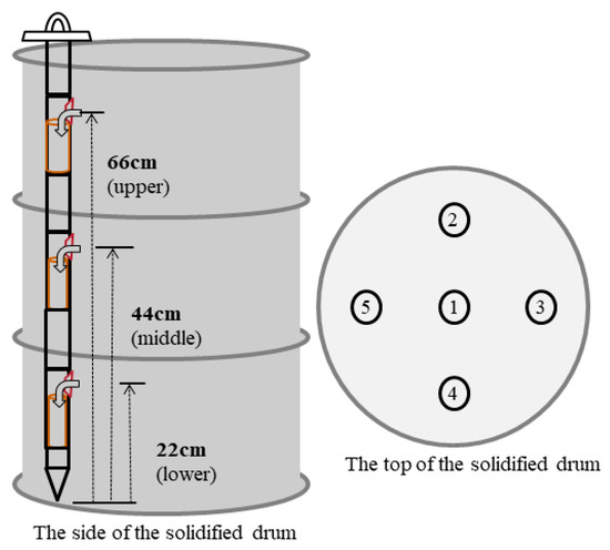 In the present study, representative samples were collected from waste-form drums fabricated in the cement solidification process within the set time frame, i.e., 3.5 h of the initial setting time of the drums, using a specially designed sample collector. This sample collector was designed to collect multiple samples at the same time along the vertical direction of each drum, i.e., from the upper (66 cm), middle (44 cm), and lower (22 cm) parts of each drum. The collector can be equipped with a polyethylene mold (φ of 5 cm and a height of 12 cm) at each of the three positions. Figure 2 shows five collection points for representative samples and another three points along the vertical direction of the drum (upper, middle, and lower positions) for each collection point. First, five points on the top surface of the drum were selected, including the center of the drum, and sample collectors were then inserted at each of the five points to collect three representative samples at the same time along the vertical direction of the drum, i.e., from the upper, middle, and lower parts, to ensure that the collected samples can properly represent the properties of the tested drum. As a result, a total of 15 samples were collected from each drum, i.e., three samples from each of the five points.
