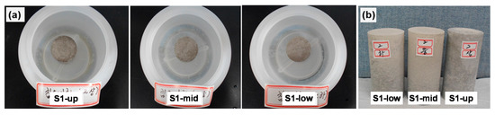 The structural safety of the waste forms was evaluated by measuring their compressive strength after the early compressive strength tests, thermal cycling tests, water immersion tests, and irradiation tests. The obtained samples were crushed before being subjected to free-standing water tests. Figure 4 shows images of representative samples of the waste-form drums subjected to the water immersion test (a) and the samples after the test (b).