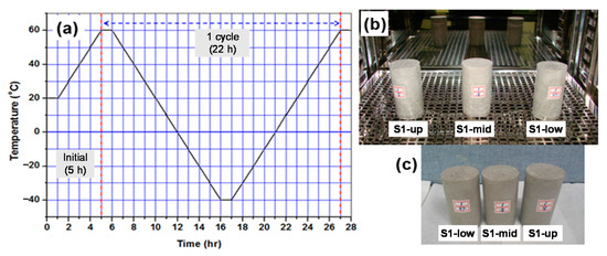 A single cycle in thermal cycling testing consists of a cooling step from 60 °C to −40 °C, followed by a heating step from −40 °C back to 60 °C at a rate of 10 °C/h over a total period of 22 h. These thermal cycling tests were repeated for a total of 30 cycles, and it took about 28 days. Following the thermal cycling tests, the waste form samples were then subjected to a visual inspection for any cracks or other defects, and then their compressive strength was measured. Figure 5 shows an illustration of temperature changes during a single cycle (a) and images of the samples subjected to the test (b) and after the test (c).