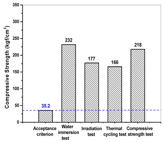 Figure 7 presents changes in the weight and volume of waste form samples after the thermal cycling tests, irradiation tests, water immersion tests, and leaching tests. After each of these tests, the samples were stored in a curing room for two days, and then their weight and volume were measured. The weight of the waste form samples decreased by 10.94% and 4.80% after the thermal cycling tests and irradiation tests, respectively. In contrast, the weight increased by 2.86% and 2.50% after the water immersion tests and leaching tests, respectively. The observed changes in the weight of the samples were attributed to dehydration or water absorption selectively occurring in the samples depending on the nature of each test. It was also found that, even after the samples were stored in a curing room for two days, their weight did not return to their initial levels. The respective volume changes observed in the samples after each test were all 0.23% or less and thus were considered measurement errors. The measured properties of the cement waste form samples were assessed against the WAC, as shown in Figure 8. The compressive strengths of each sample ranged from 166 to 232 kgf/cm2, which are greater than the threshold provided in the WAC at 35.2 kgf/cm2 (3.44 MPa). This result confirmed that the waste-form drums provided sufficient structural stability for disposal considerations.