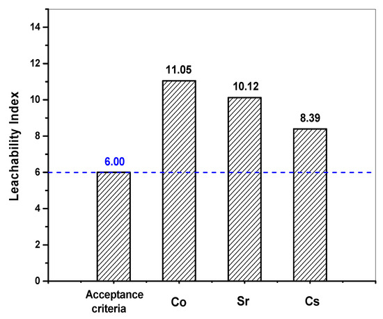 The leaching safety of the representative samples of waste forms was evaluated in terms of the leachability index (LX) specified in the WAC. The LX is defined as Equation (5).