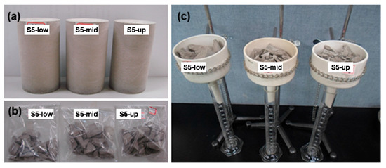The volume content of free-standing water in waste forms must be 0.5 vol.% or less. In the present study, three representative specimens collected from the waste-form drums were used in free-standing water tests. The diameter and height of the three specimens were measured using vernier calipers to estimate their volume. Before being tested, the specimens were crushed to ensure that free-standing water contained inside them could be easily released. Figure 12 shows images of free-standing water test specimens (a), crushed specimens (b), and the experimental settings for the test (c). The results confirmed that free-standing water had not been generated (all specimens show 0.0 vol.%). Overall, in the present study, the waste-form drums were tested for the six test items provided in the WAC for low- and intermediate-level radioactive waste, and the results confirmed that the drums adequately met the requirements of the six test items provided in the WAC.